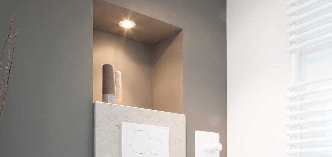 → Naturstein im Bad und Gäste WC. Fugenlose Großformatplatten